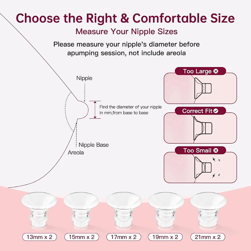 You’ll measure the diameter of your nipple (not including the areola) and match it to the sizing guide included in the kit. The kit helps you test different sizes to find the most comfortable and efficient fit.